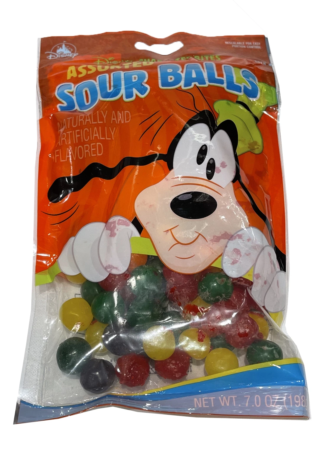These Assorted Sour Balls Candy come right from Walt Disney World, in a tightly sealed 6.0 oz sized bag, with a zip lock to keep fresh. Features Goofy design.