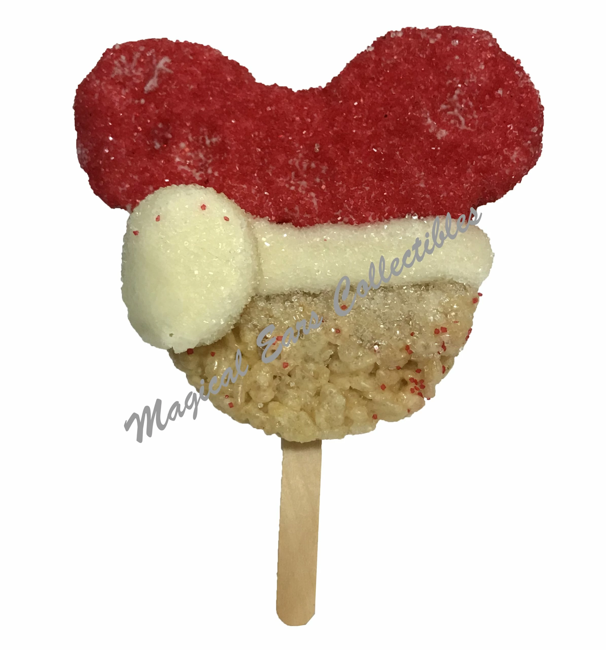 This Holiday Minnie’s bake Shop Rice Crispy treat on a stick is shaped into a Mickey head, and designed with a Red Santa Hat. Direct from Walt Disney World.